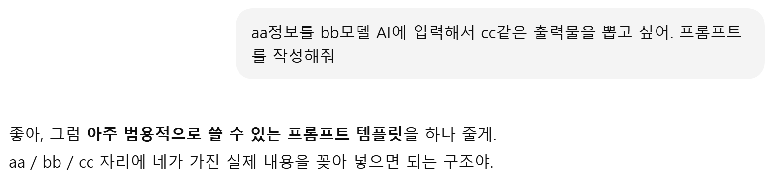 "aa정보를 bb모델 AI에 입력해서 cc같은 출력물을 뽑고 싶어. 프롬프트를 작성해줘"