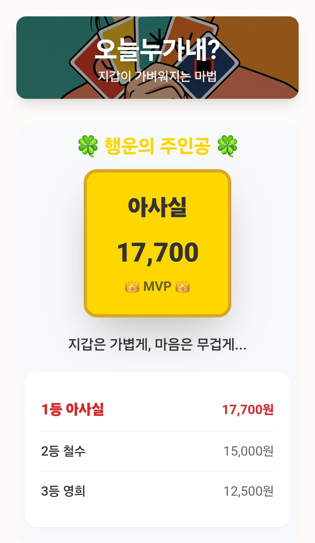 오늘 밥값의 주인공을 정해주는 랜덤 정산 게임!